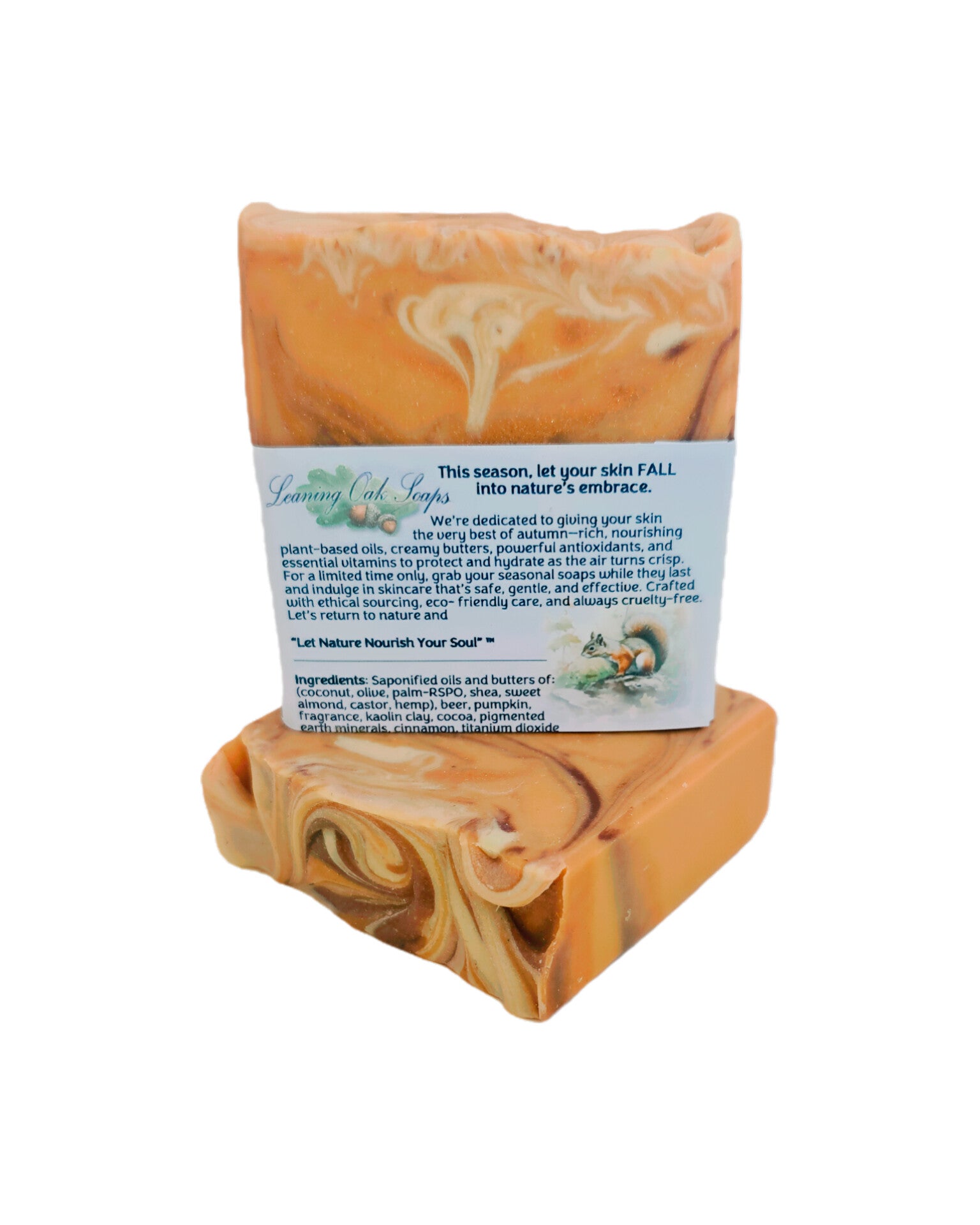 Discover the ultimate Fall experience with our Drunken Pumpkin Beer Soap. Our unique process involves replacing water with beer and pumpkin for a rich and nourishing lather. The hops in beer have well-known anti-inflammatory properties, making this soap perfect for soothing itchy and inflamed skin. And as the colder seasons approach, your skin will thank you for the added vitamins and nutrients found in beer and pumpkin. Get ready to indulge in the scent of "Bonfire Bliss" - a fragrance reminiscent of gentle dusky breezes and bonfires with notes of dried wind blown leaves, heliotrope, charred woods of pine and cedar, amber, smoky sandalwood and musk. Back ground notes contain hints of roasted marshmallows, brown sugar, coconut and soft vanilla.