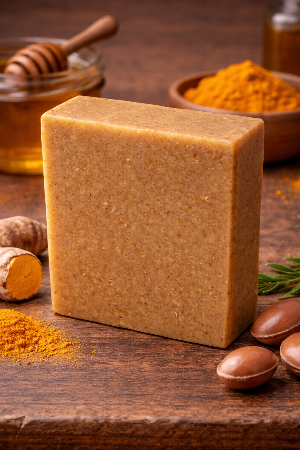 Ingredients: Saponified Oils and Butters of: (Olive, Coconut, Castor, Cocoa, Shea, Argan), Turmeric, Licorice Root, Honey, Sodium Lactate