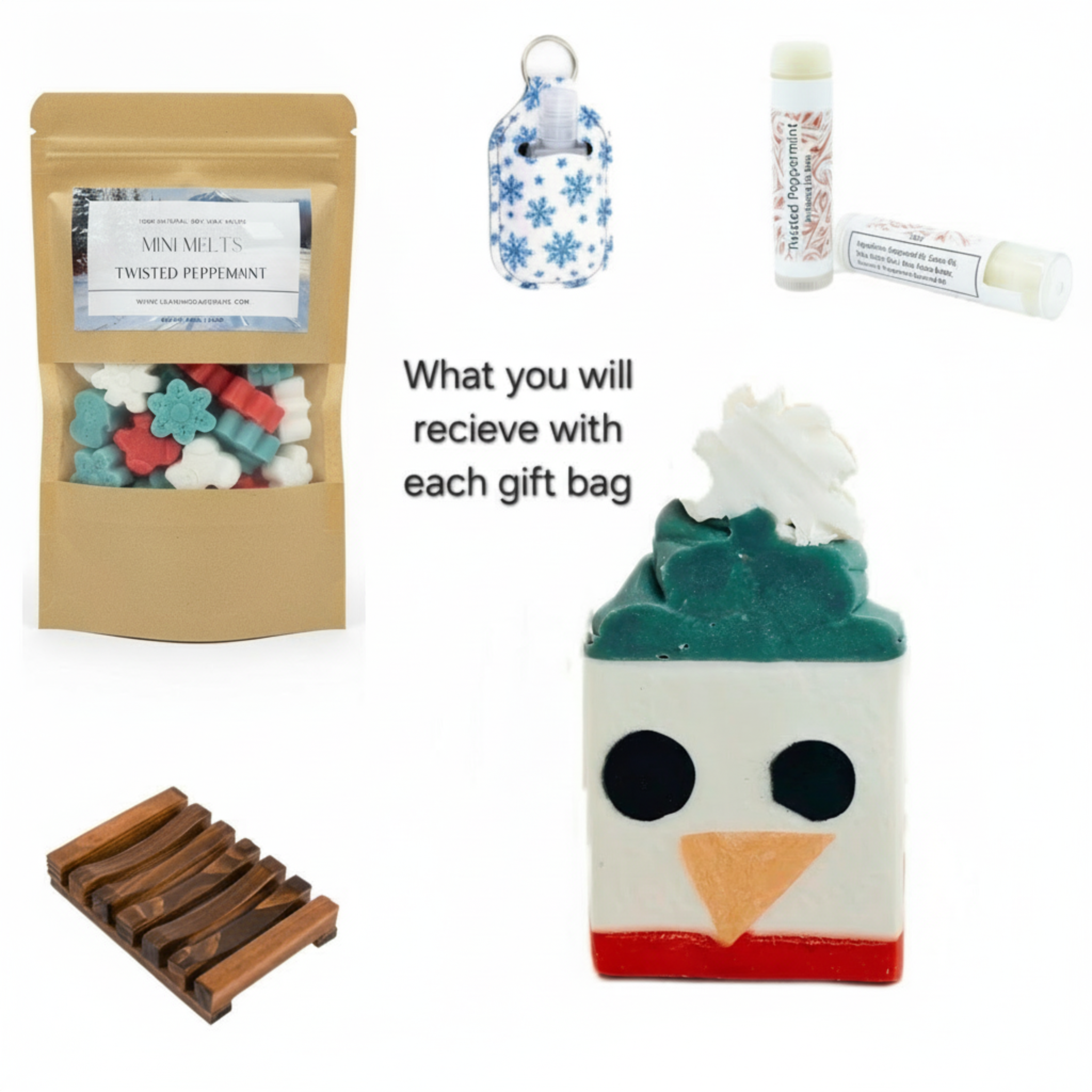 Our products are made with sustainably sourced, natural plant-based ingredients. The soap is gentle on skin, the peppermint wax melts create a cozy atmosphere, and the lip balm keeps lips soft through winter weather.