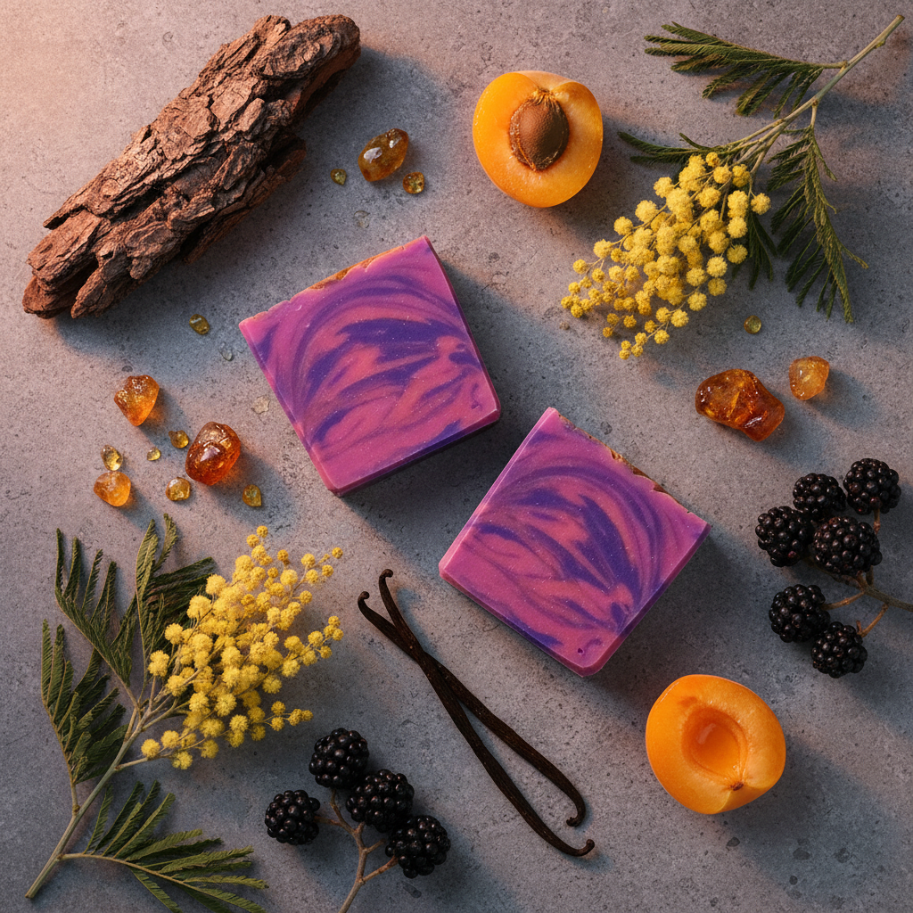 Precious woods blend with sensual amber and soft mimosa in a luxurious, woodsy embrace. Sweet apricot nectar and juicy berries add a fruity brightness, while vanilla musk creates a warm, comforting base that lingers on the skin.